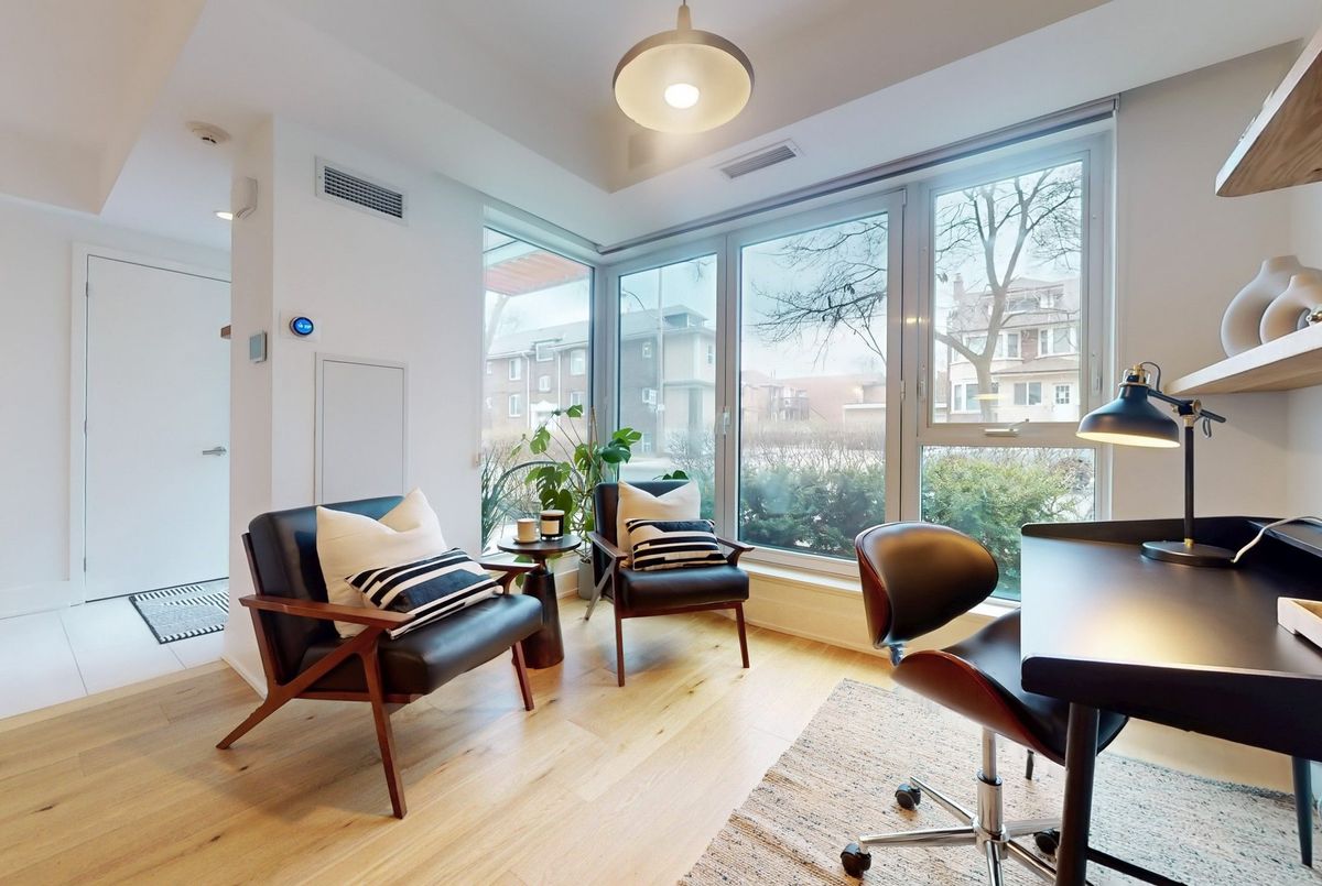 This one feels just like home. Private street-level entrance, bright spacious open concept layout with all the bonus touches of condo-living; like underground heated parking, swoon worthy amenities plus your very own giant sized private locker room, and a bonus locker space for good measure. Originally a 3-bedroom, this 1,351 sq ft unit is currently configured as a spacious 2+1 bed, 3 bath with easy potential to convert back. The open-concept main floor boasts a chefs kitchen with quartz island, dedicated dining room, and ample storage. Upper level features 2 spacious bedrooms, including a primary retreat with 5-pc ensuite, walk-in closet & private balcony with a view of the iconic High Park - with 400 acres of; trails, tennis courts, a zoo, a pond, trees and cherry blossoms. Walkable to restaurants, UP express, TTC & short drive to Gardiner. This is the ultimate urban escape ~ it doesn't get much better than this!