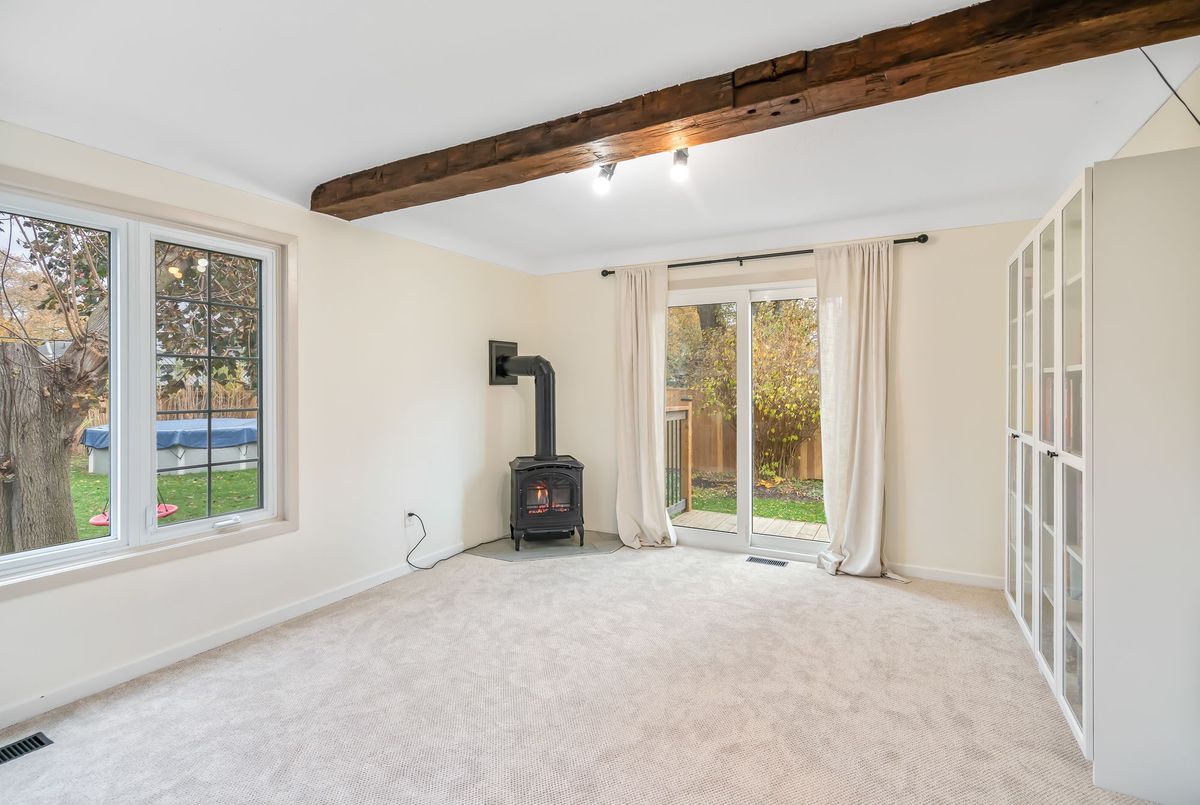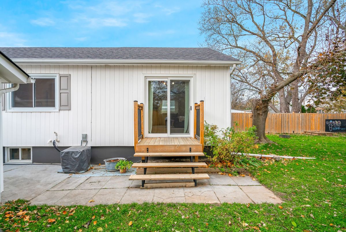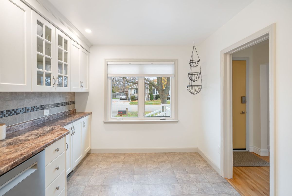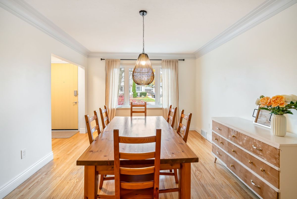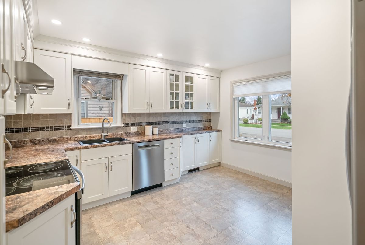 Located in the heart of the north end, within walking distance to the neighbouhood park and school, this meticulously maintained 1,400 square foot bungalow sits on a quiet, tree-lined street where families walk their dogs and neighbours still wave to one another. The stamped-concrete 4 car driveway and well-kept exterior immediately set the tone. A large detached garage with drive-through rear door adds convenience and versatility, while the enclosed breezeway keeps everyday coming and going comfortable in any season. Inside, the home feels warm, inviting, and exceptionally cared for. Hardwood flooring flows through the front living/dining area and then onwards to the hallway and bedrooms. The white and bright kitchen features stainless steel appliances, tiled backsplash, pot lighting, and a large window overlooking the front yard perfect for watching kids arrive from school or keeping an eye out for arriving guests or deliveries. The original living room is currently styled as a spacious dining room, although the layout easily adapts to suit your lifestyle. At the back of the home, a large main floor family room is perfect for everyday living. It features brand-new carpeting (November 2025), a freestanding gas fireplace, beamed ceiling, sliding patio doors, and a picture window overlooking the backyard. The 5-piece bathroom includes double sinks and a combined jetted tub with shower. The lower level currently functions as a full primary suite with vinyl plank flooring, pot lighting, a walk-in closet, rough-in for bar/kitchenette, and a modern 4-piece ensuite with tiled shower, glass panel, and double sinks. Mechanical updates include new furnace/hwt (2020), central air (2023), upgraded insulation in attic to R40 (2020), roof shingles (2024) plus all updated windows. The fully fenced, big and private backyard is designed for real-life enjoyment.