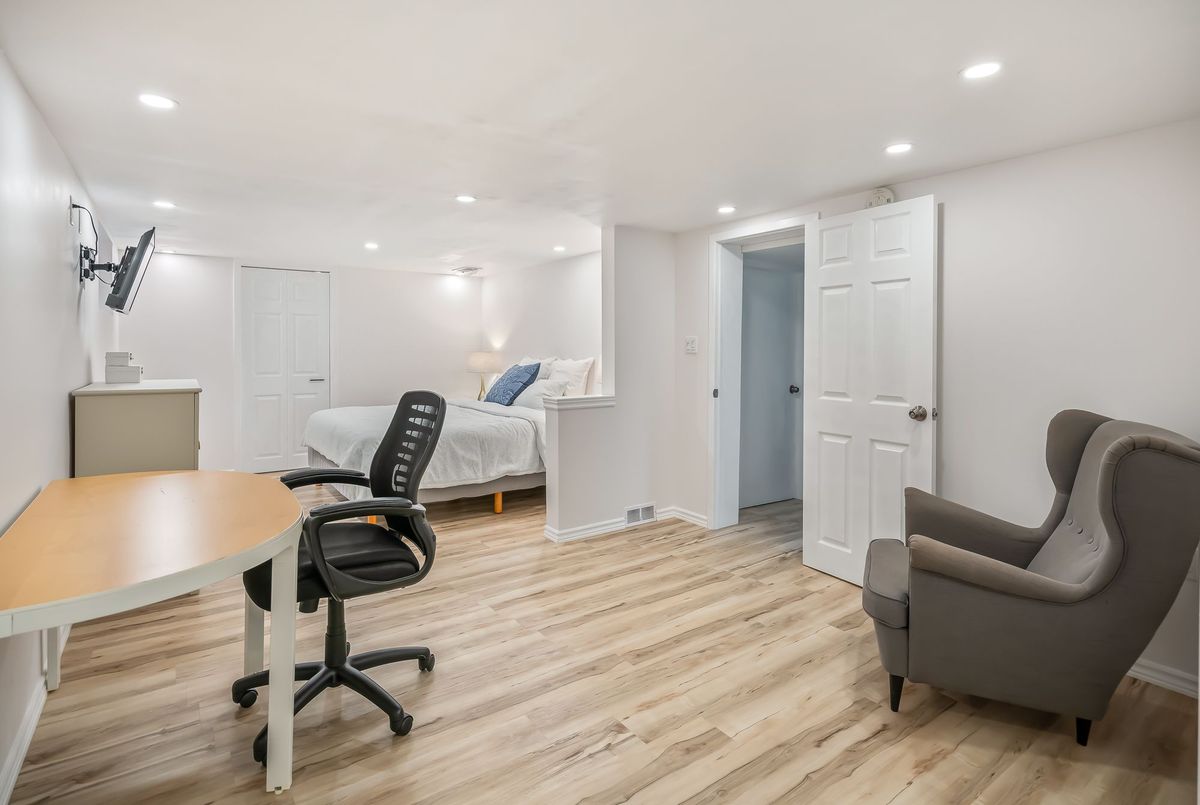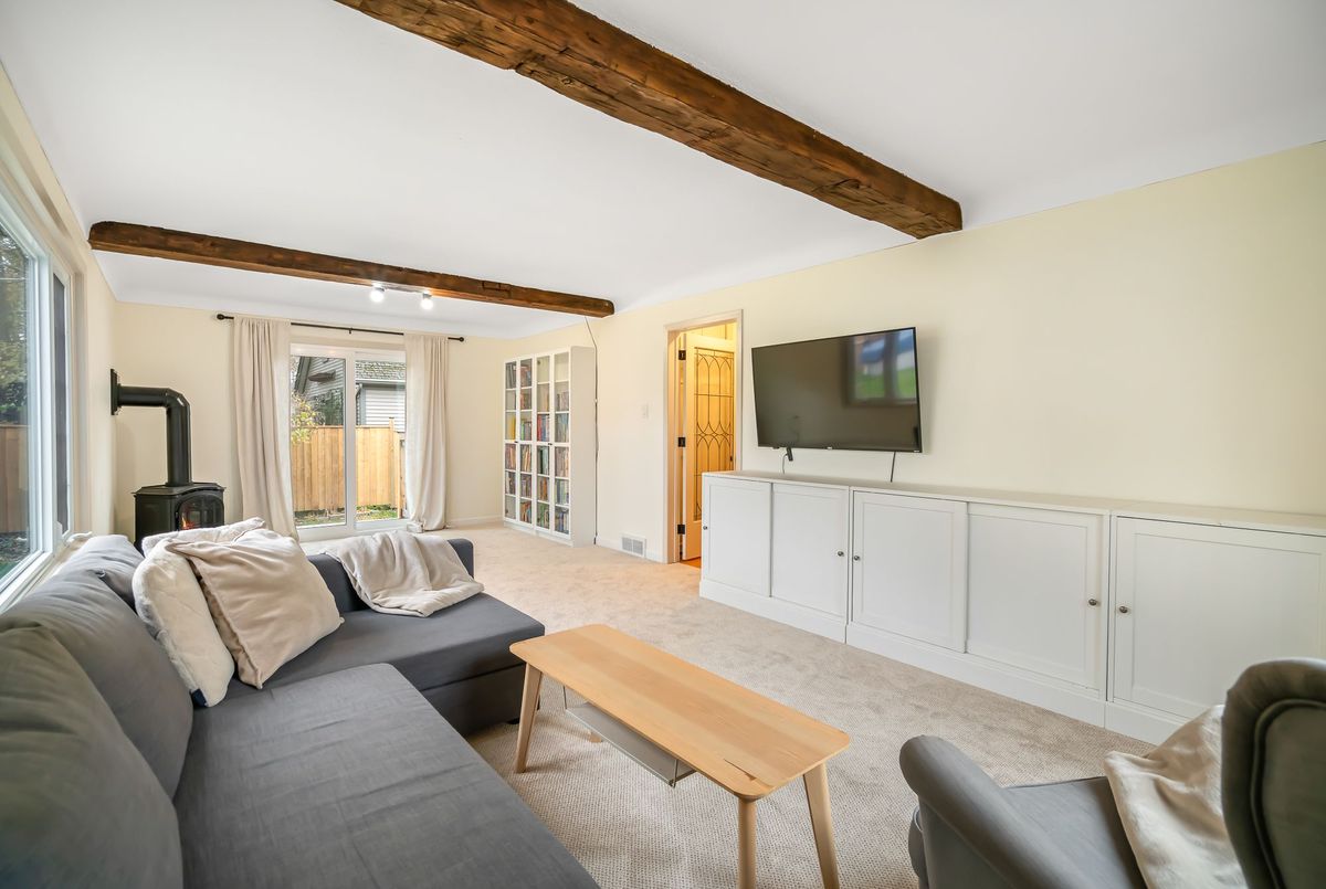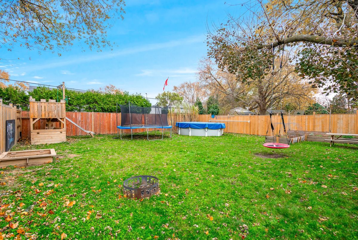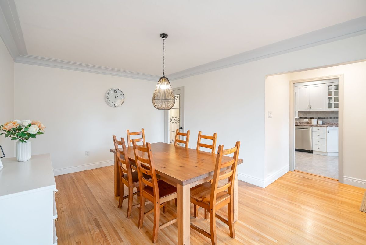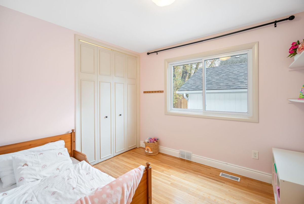 Located in the heart of the north end, within walking distance to the neighbouhood park and school, this meticulously maintained 1,400 square foot bungalow sits on a quiet, tree-lined street where families walk their dogs and neighbours still wave to one another. The stamped-concrete 4 car driveway and well-kept exterior immediately set the tone. A large detached garage with drive-through rear door adds convenience and versatility, while the enclosed breezeway keeps everyday coming and going comfortable in any season. Inside, the home feels warm, inviting, and exceptionally cared for. Hardwood flooring flows through the front living/dining area and then onwards to the hallway and bedrooms. The white and bright kitchen features stainless steel appliances, tiled backsplash, pot lighting, and a large window overlooking the front yard perfect for watching kids arrive from school or keeping an eye out for arriving guests or deliveries. The original living room is currently styled as a spacious dining room, although the layout easily adapts to suit your lifestyle. At the back of the home, a large main floor family room is perfect for everyday living. It features brand-new carpeting (November 2025), a freestanding gas fireplace, beamed ceiling, sliding patio doors, and a picture window overlooking the backyard. The 5-piece bathroom includes double sinks and a combined jetted tub with shower. The lower level currently functions as a full primary suite with vinyl plank flooring, pot lighting, a walk-in closet, rough-in for bar/kitchenette, and a modern 4-piece ensuite with tiled shower, glass panel, and double sinks. Mechanical updates include new furnace/hwt (2020), central air (2023), upgraded insulation in attic to R40 (2020), roof shingles (2024) plus all updated windows. The fully fenced, big and private backyard is designed for real-life enjoyment.