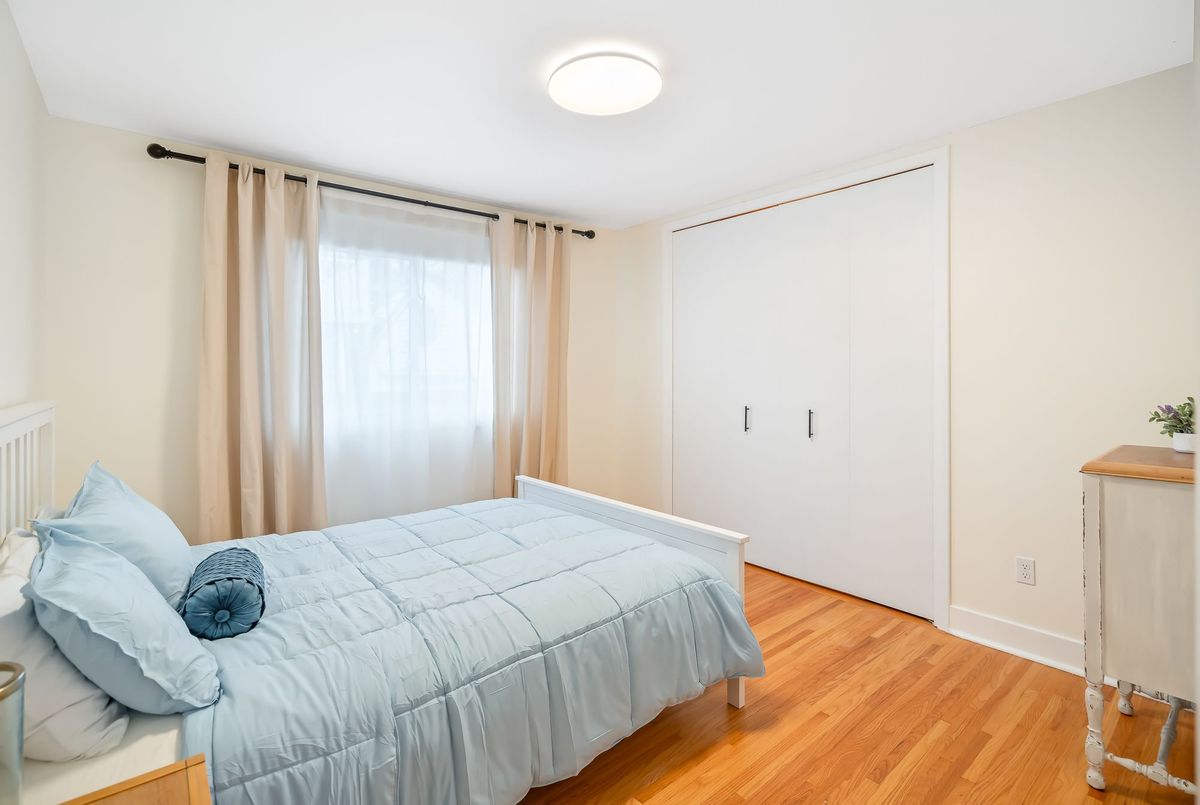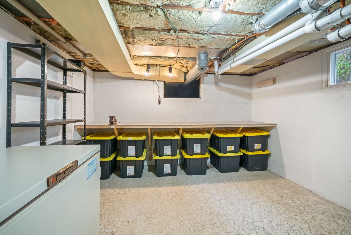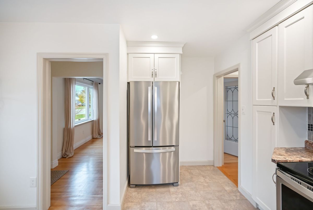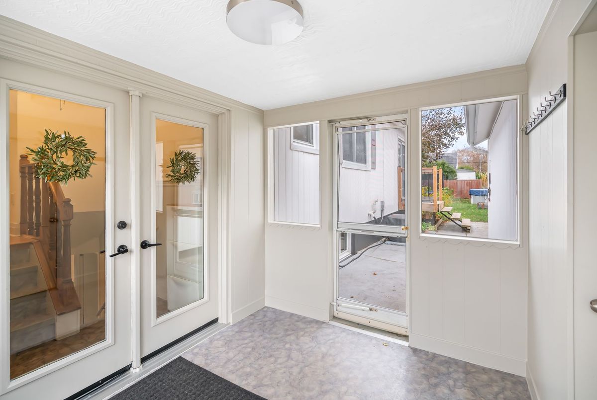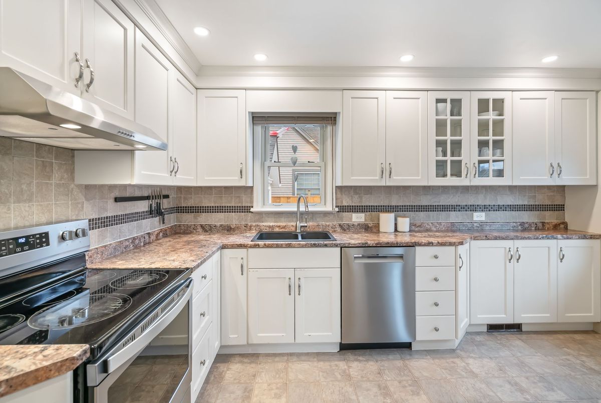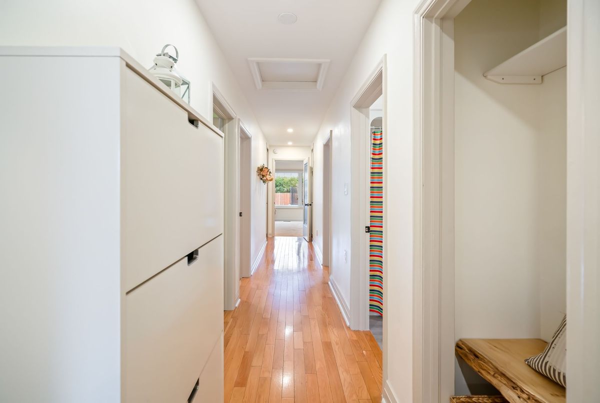 Located in the heart of the north end, within walking distance to the neighbouhood park and school, this meticulously maintained 1,400 square foot bungalow sits on a quiet, tree-lined street where families walk their dogs and neighbours still wave to one another. The stamped-concrete 4 car driveway and well-kept exterior immediately set the tone. A large detached garage with drive-through rear door adds convenience and versatility, while the enclosed breezeway keeps everyday coming and going comfortable in any season. Inside, the home feels warm, inviting, and exceptionally cared for. Hardwood flooring flows through the front living/dining area and then onwards to the hallway and bedrooms. The white and bright kitchen features stainless steel appliances, tiled backsplash, pot lighting, and a large window overlooking the front yard perfect for watching kids arrive from school or keeping an eye out for arriving guests or deliveries. The original living room is currently styled as a spacious dining room, although the layout easily adapts to suit your lifestyle. At the back of the home, a large main floor family room is perfect for everyday living. It features brand-new carpeting (November 2025), a freestanding gas fireplace, beamed ceiling, sliding patio doors, and a picture window overlooking the backyard. The 5-piece bathroom includes double sinks and a combined jetted tub with shower. The lower level currently functions as a full primary suite with vinyl plank flooring, pot lighting, a walk-in closet, rough-in for bar/kitchenette, and a modern 4-piece ensuite with tiled shower, glass panel, and double sinks. Mechanical updates include new furnace/hwt (2020), central air (2023), upgraded insulation in attic to R40 (2020), roof shingles (2024) plus all updated windows. The fully fenced, big and private backyard is designed for real-life enjoyment.
