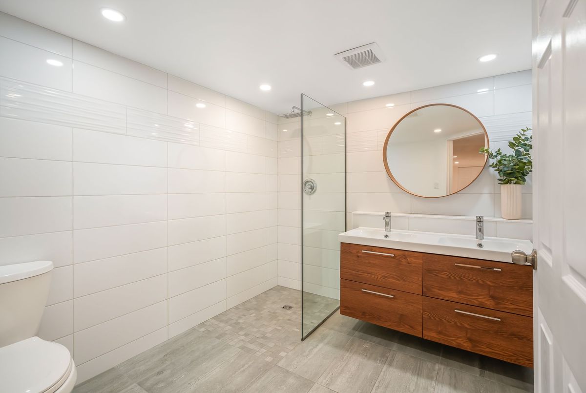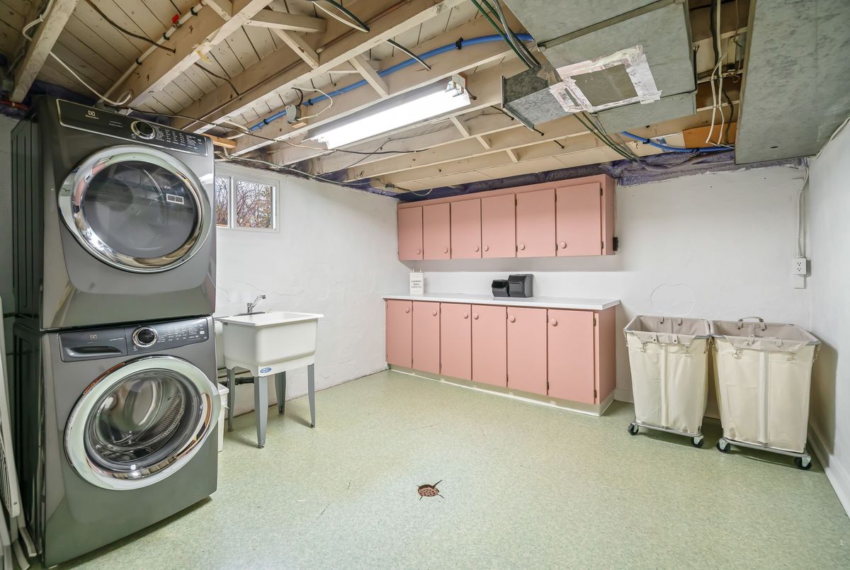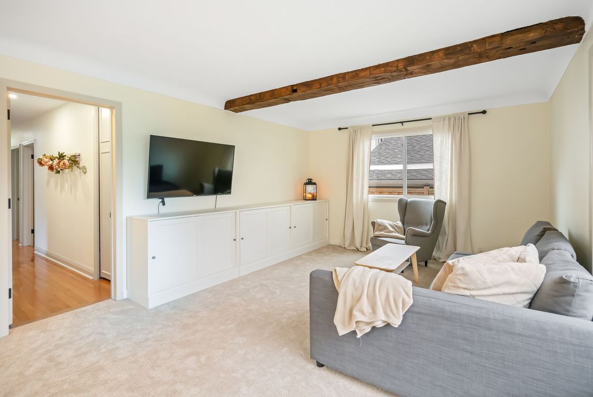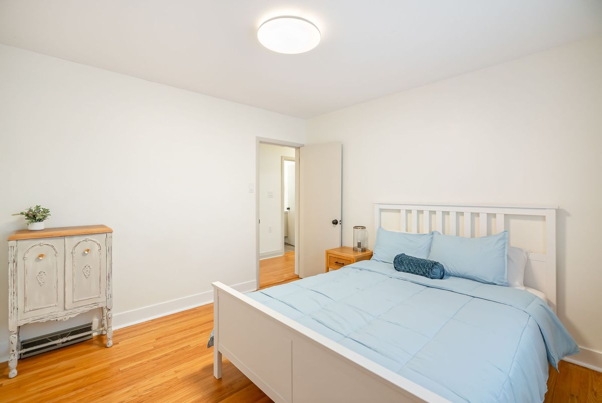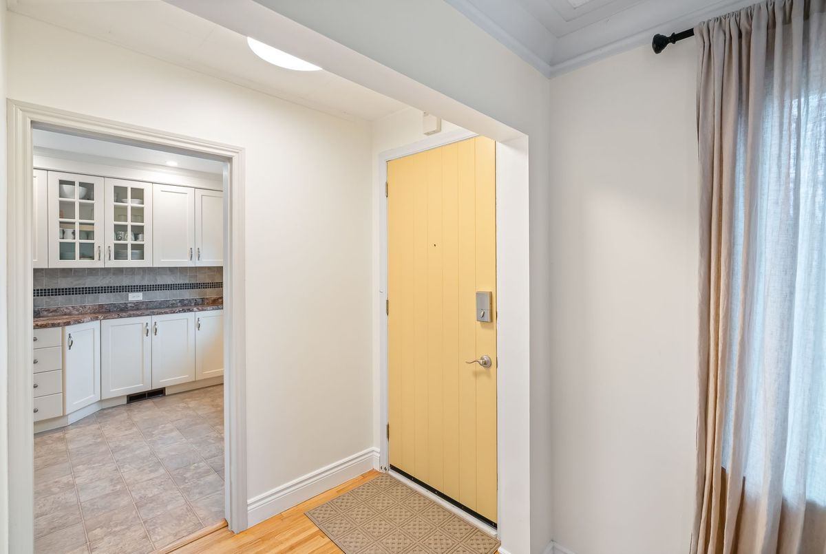 Located in the heart of the north end, within walking distance to the neighbouhood park and school, this meticulously maintained 1,400 square foot bungalow sits on a quiet, tree-lined street where families walk their dogs and neighbours still wave to one another. The stamped-concrete 4 car driveway and well-kept exterior immediately set the tone. A large detached garage with drive-through rear door adds convenience and versatility, while the enclosed breezeway keeps everyday coming and going comfortable in any season. Inside, the home feels warm, inviting, and exceptionally cared for. Hardwood flooring flows through the front living/dining area and then onwards to the hallway and bedrooms. The white and bright kitchen features stainless steel appliances, tiled backsplash, pot lighting, and a large window overlooking the front yard perfect for watching kids arrive from school or keeping an eye out for arriving guests or deliveries. The original living room is currently styled as a spacious dining room, although the layout easily adapts to suit your lifestyle. At the back of the home, a large main floor family room is perfect for everyday living. It features brand-new carpeting (November 2025), a freestanding gas fireplace, beamed ceiling, sliding patio doors, and a picture window overlooking the backyard. The 5-piece bathroom includes double sinks and a combined jetted tub with shower. The lower level currently functions as a full primary suite with vinyl plank flooring, pot lighting, a walk-in closet, rough-in for bar/kitchenette, and a modern 4-piece ensuite with tiled shower, glass panel, and double sinks. Mechanical updates include new furnace/hwt (2020), central air (2023), upgraded insulation in attic to R40 (2020), roof shingles (2024) plus all updated windows. The fully fenced, big and private backyard is designed for real-life enjoyment.